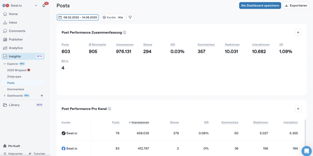 Tipp: Wenn du Reports in Swat.io erstellst, werden die Daten automatisch ansprechend aufbereitet. Du kannst ein .pdf herunterladen, das du direkt weiterleiten kannst.