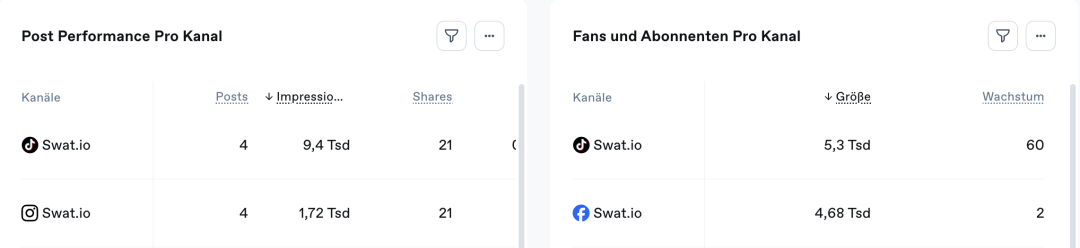 Passe das Format jedes Widgets ganz einfach in den jeweiligen Einstellungen an oder ziehe es vom rechten unterern Eck in die passende Größe. Auch hier kannst du jederzeit den Widget-Namen über das Stift-Icon ändern. Die Widgets lassen sich zusätzlich filtern, z.B. nach Kanal, Zeitraum oder Post-Typ.