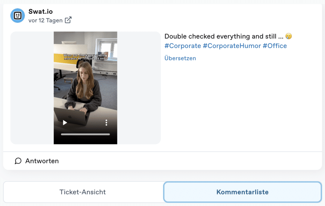 Dort werden dir alle Kommentare zum jeweiligen Post nach Datum sortiert angezeigt. Im Gegensatz zum regulären Ticket kannst du in dieser Ansicht nach Stimmung und Status der Kommentare filtern und so den perfekten Workflow für dich etablieren.