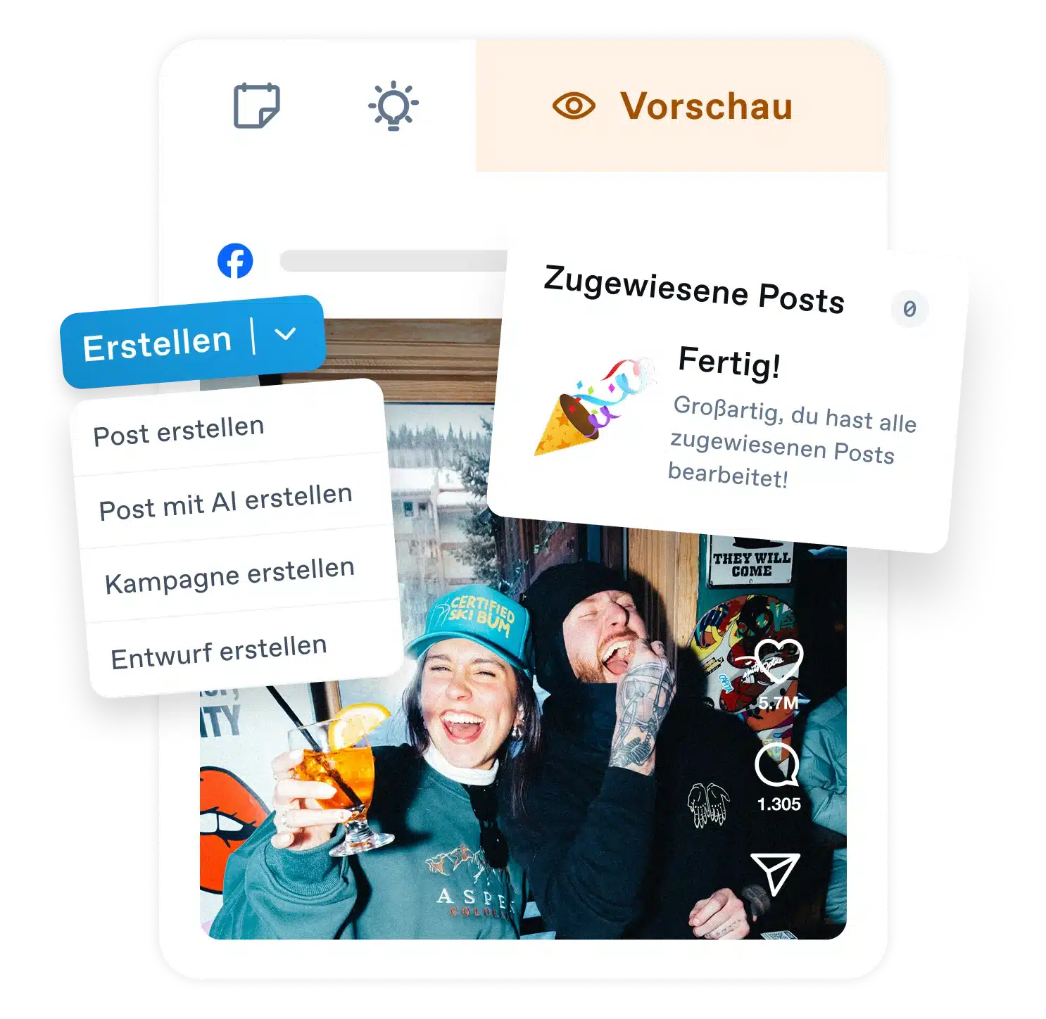 Egal ob Bilder, Reels oder Stories - veröffentliche deine Beiträge auf Instagram, kooperiere mit Co-Autor:innen und kümmere dich um Community Management und Analytics.