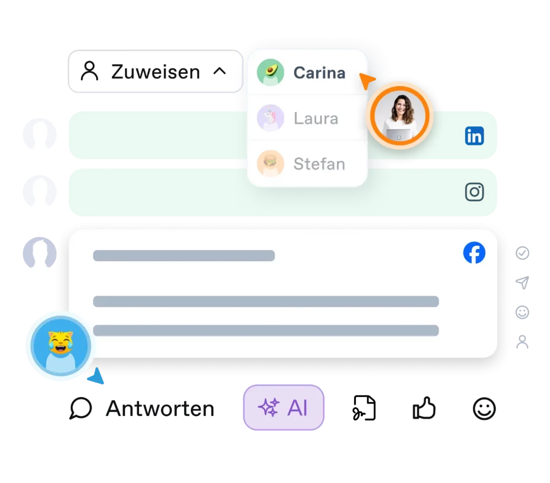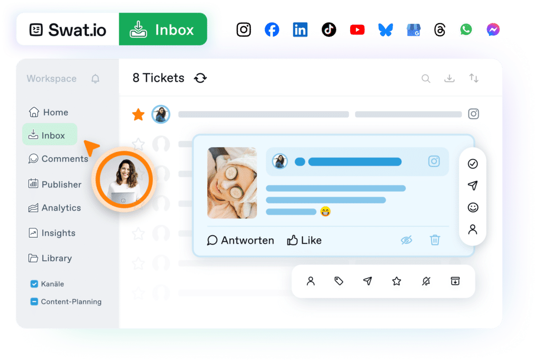 Verwalte deine gesamte Social Media Kommunikation an einem Ort. Die Swat.io Inbox zeigt dir Nachrichten und Erwähnungen aus allen Kanälen in einem übersichtlichen Posteingang. Antworte, like, verberge oder lösche Kommentare direkt in der Inbox.Zuweisen von Nachrichten und interne Abstimmungen