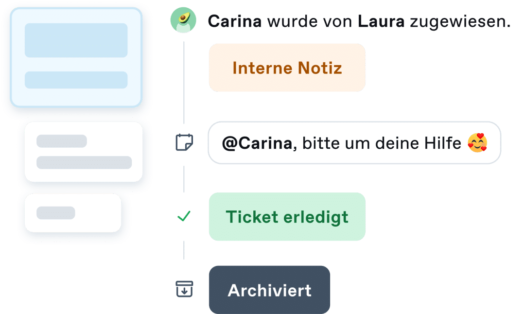 Verteile Tickets mit einem Klick an die richtige Person im Team. So vermeidest du komplizierte E-Mail-Abstimmungen und machst Zuständigkeiten transparent. Im internen Protokoll stimmst du dich bei Fragen mit Kolleg:innen ab.