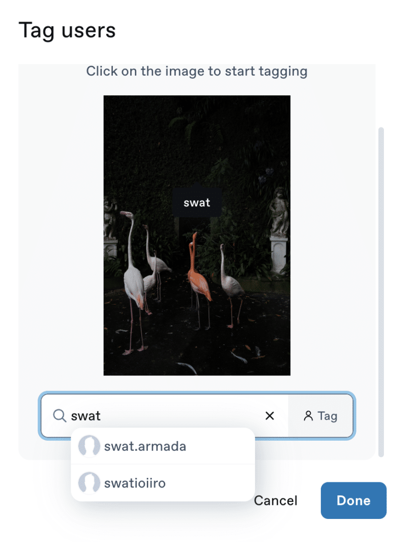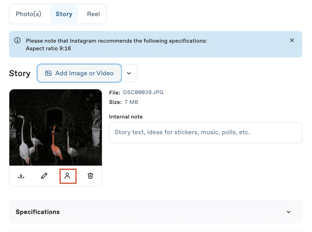 To tag someone, click the user icon on the image or video you want to post in your Story. Then, place the mention on your asset with a click and search for the username in the designated field.